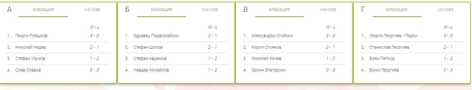 В група „Д“ Георги Георгиев – Пърси победи всички в трудни мачове, а изненадата беше отпадането на Боян Петков, който имаше няколко титли този сезон.